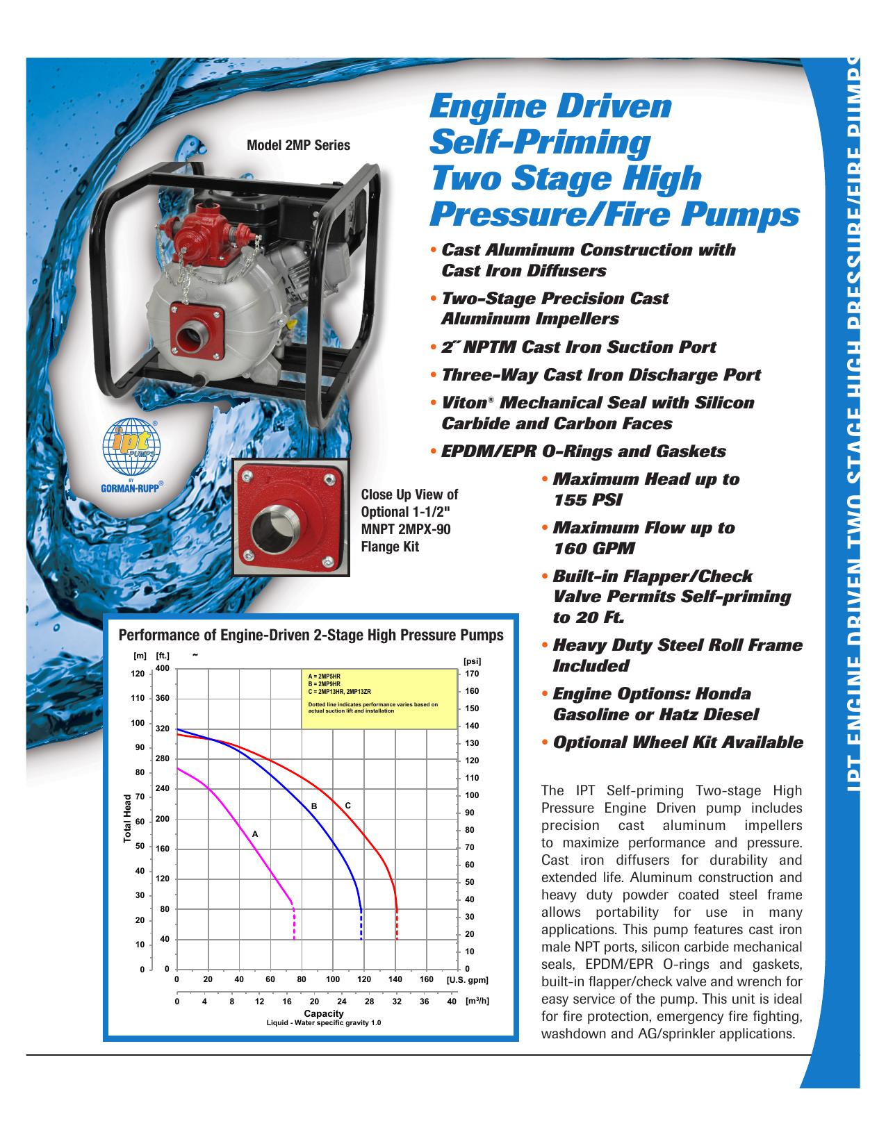 2˝ Gas Engine Driven Self-Priming Portable High-Pressure pump for fire protection or irrigation, cast aluminum. Pumps up to 130 gpm. Battery start. 5hp Honda engine. Optional hose kit available.